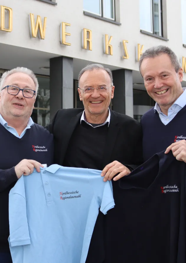 Hartmut Schäfer, 1. Vorsitzender, und Ralf Flohr, 2. Vorsitzender, haben Frank Dittmar mit T-Shirt und Pulli der Nordhessischen Regionalauswahl in ihren Reihen willkommen geheißen.